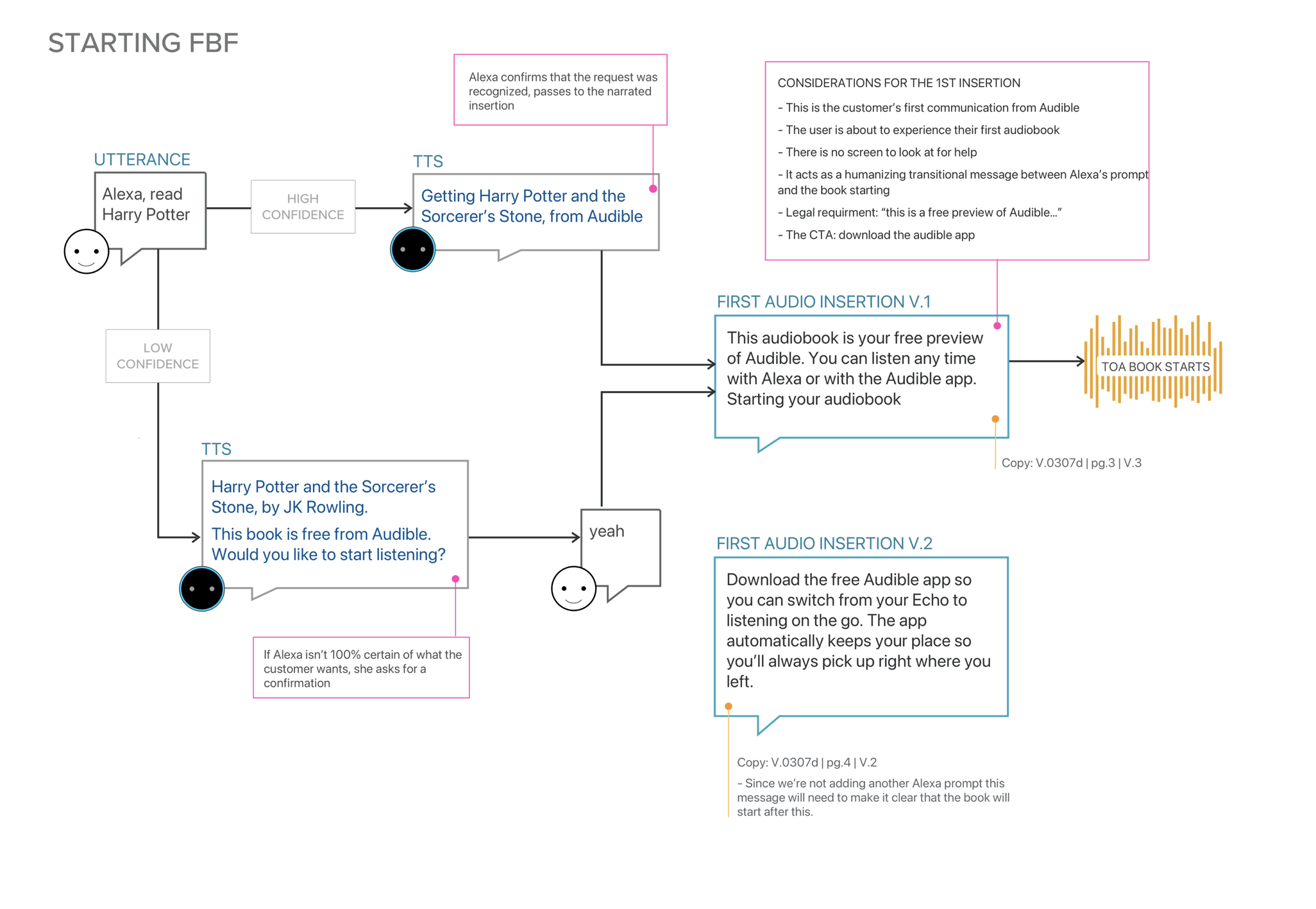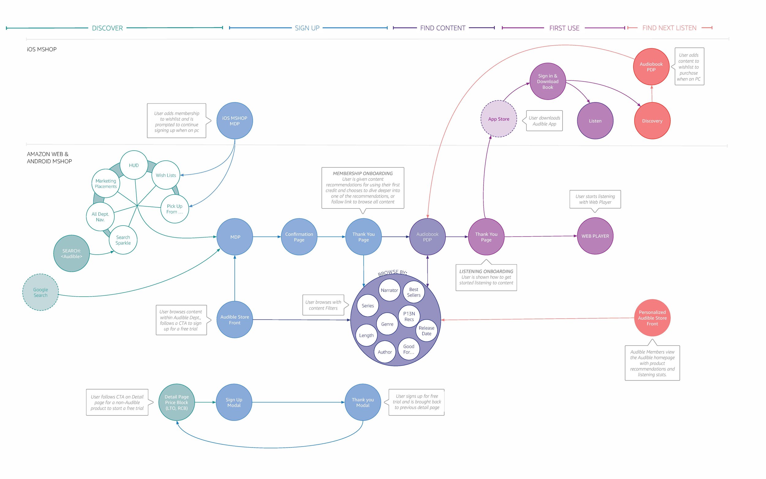 Presenting the whole system was an important step in the process. Every interaction with one part of the system - Amazon apps, audible app, Alexa app, Alexa voice powered devices - effects each other part in specific ways. My objective was to ensure a seamless and holistic end-end journey that encompassed every use case and piece of the puzzle.