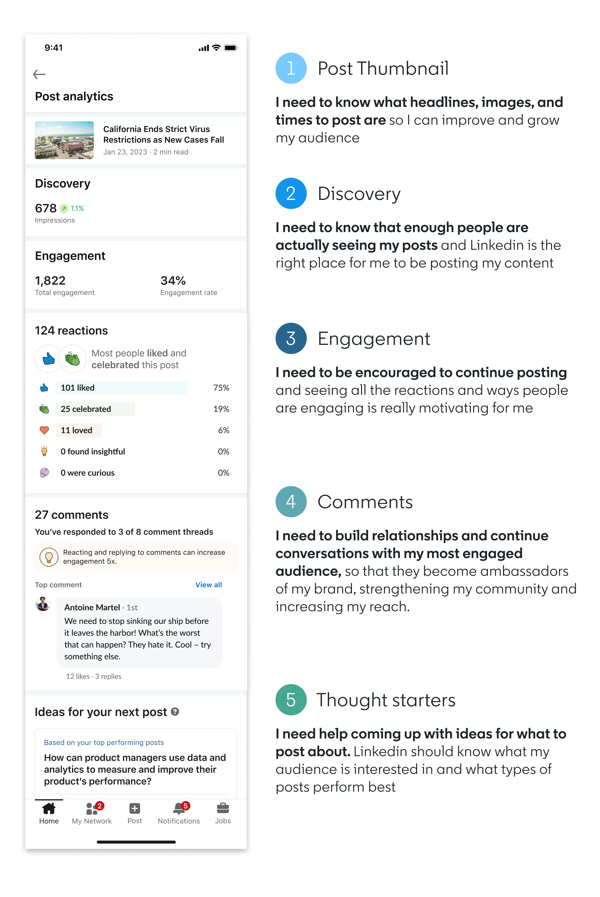 Emotional moments in the new creator journey have a huge impact on whether they will continue sharing on Linkedin. This map was used in stakeholder meetings to gain alignment on prioritizing new features and ux improvements