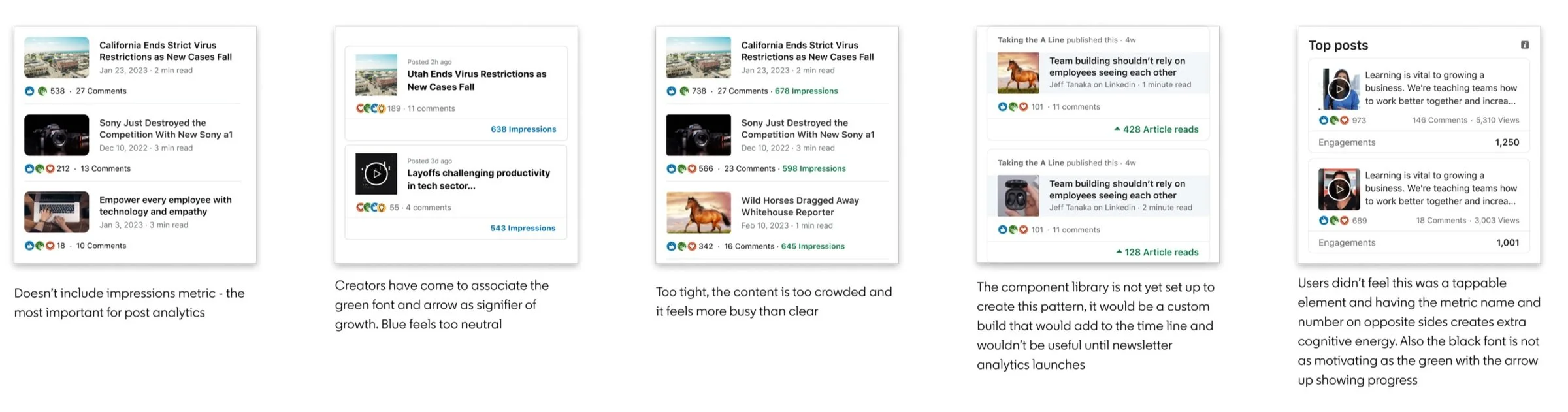 One of the first projects I took on when starting was designing a new module that listed the posts with the best engagement and impression numbers. This is just a few of the explorations that didn’t make the cut.