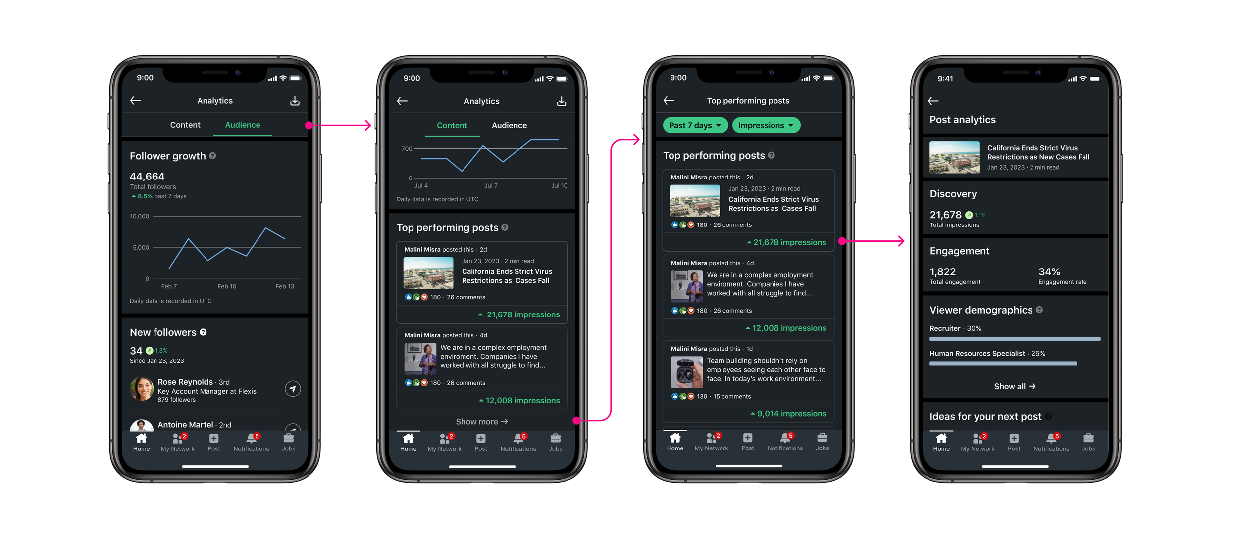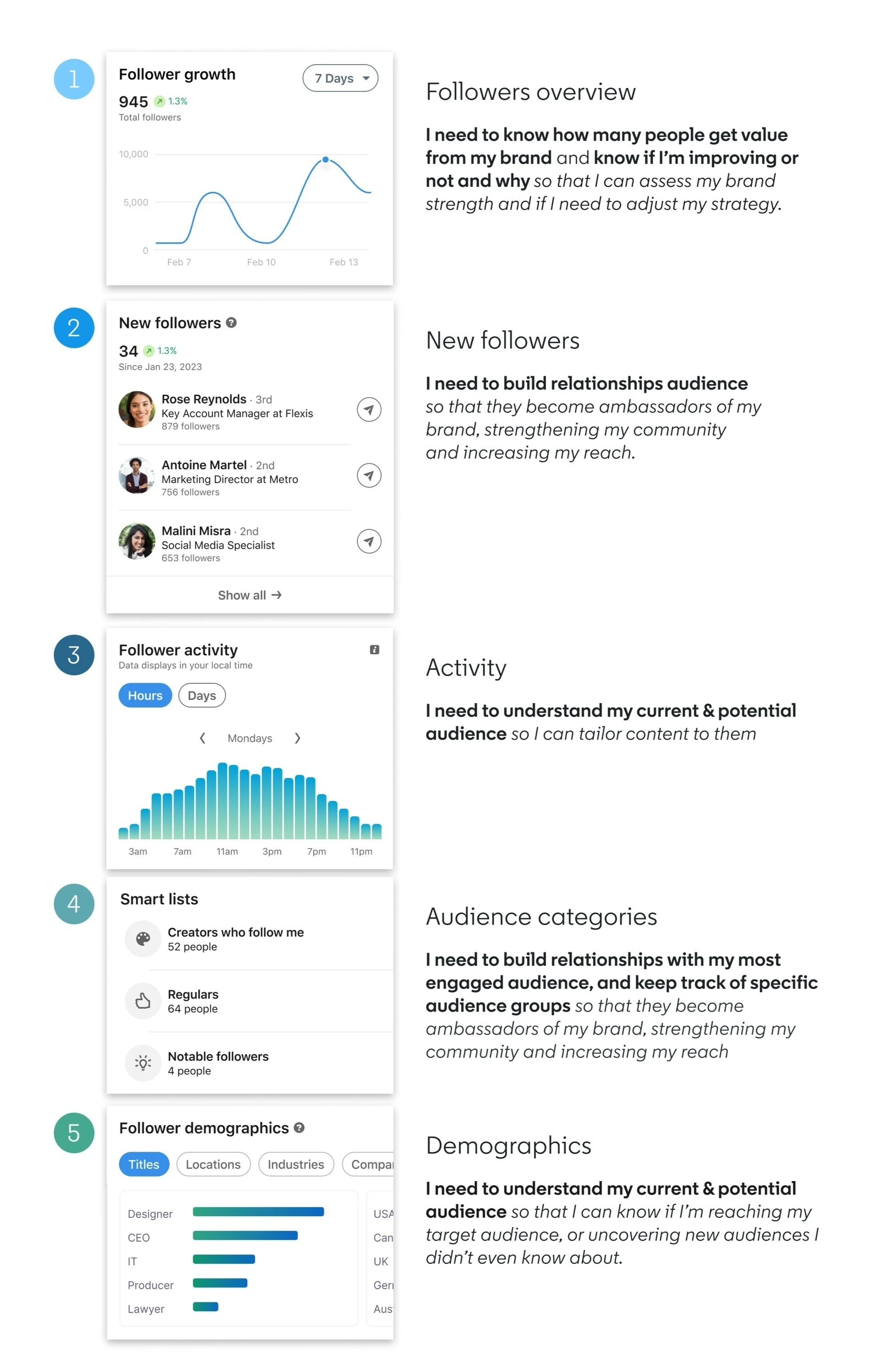 Starting in October 2022 I took the lead on designing new reporting tools and enhancing the slim analytics offerings available for creators on LinkedIn, so they can understand how their content is performing, and who their audience is.